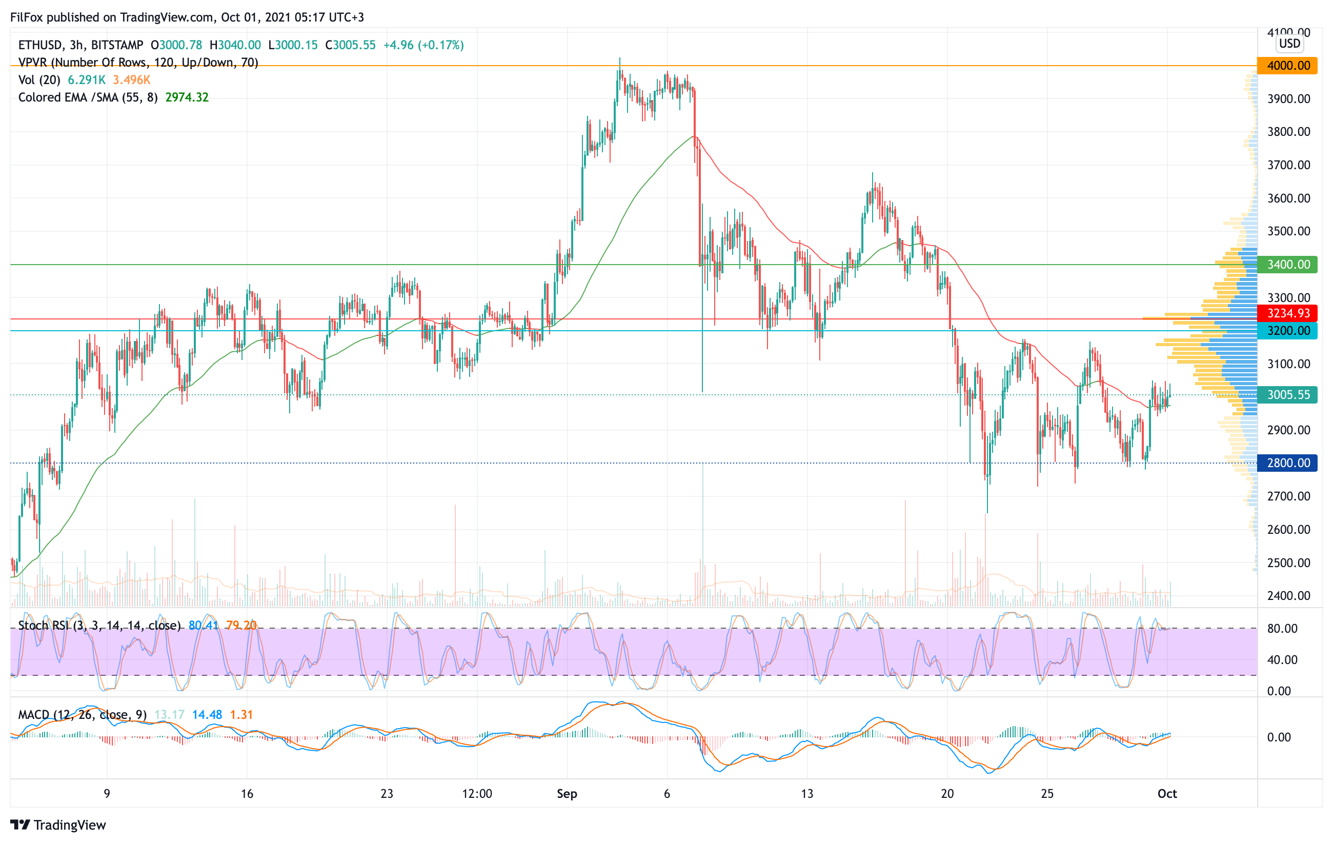 Вчера утром восстановление пары ETH/USD приостановилось в районе отметки 3050.00 USD. Цена эфира закрепилась выше трёхчасовой EMA55 и пыталась продолжить рост, но объёмы торгов были ниже среднего уровня, и все попытки удержаться выше психологической отметки 3000.00 USD оказались безуспешными.