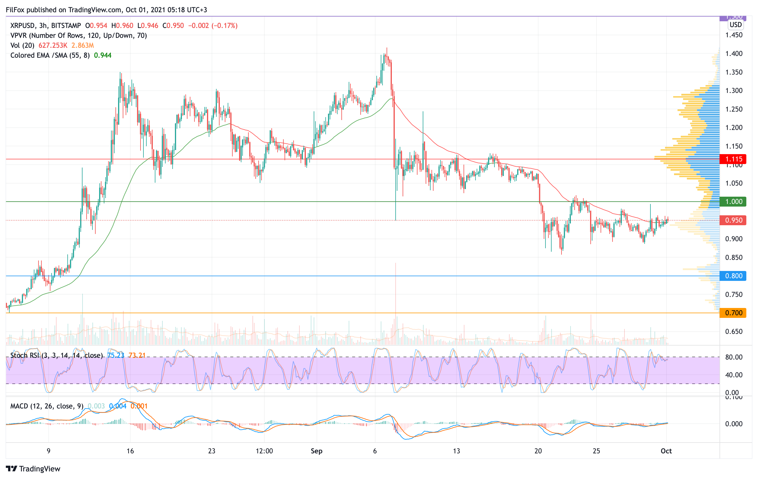 Вчера волатильность пары XRP/USD была достаточно низкой и цена Ripple консолидировалась в области трехчасовой EMA55.