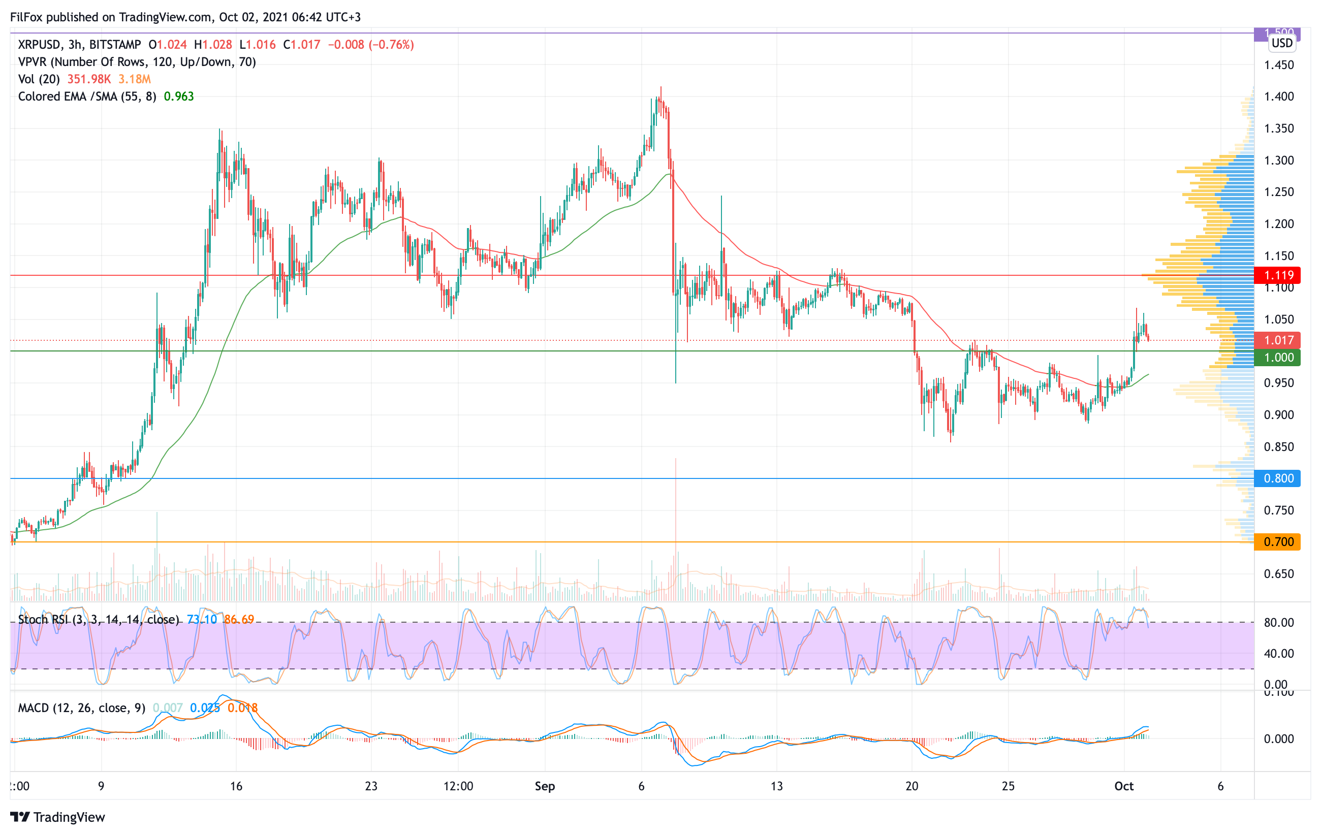 Вчера днём покупатели смогли сформировать мощный бычий импульс, и цена XRP пробила психологическое сопротивление на уровне 1.00 USD. На интенсивный рост медведи ответили крупными объёмами продаж, пытаясь вернуть пару из зоны максимума в точке 1.068 USD к цене один доллар за монету.