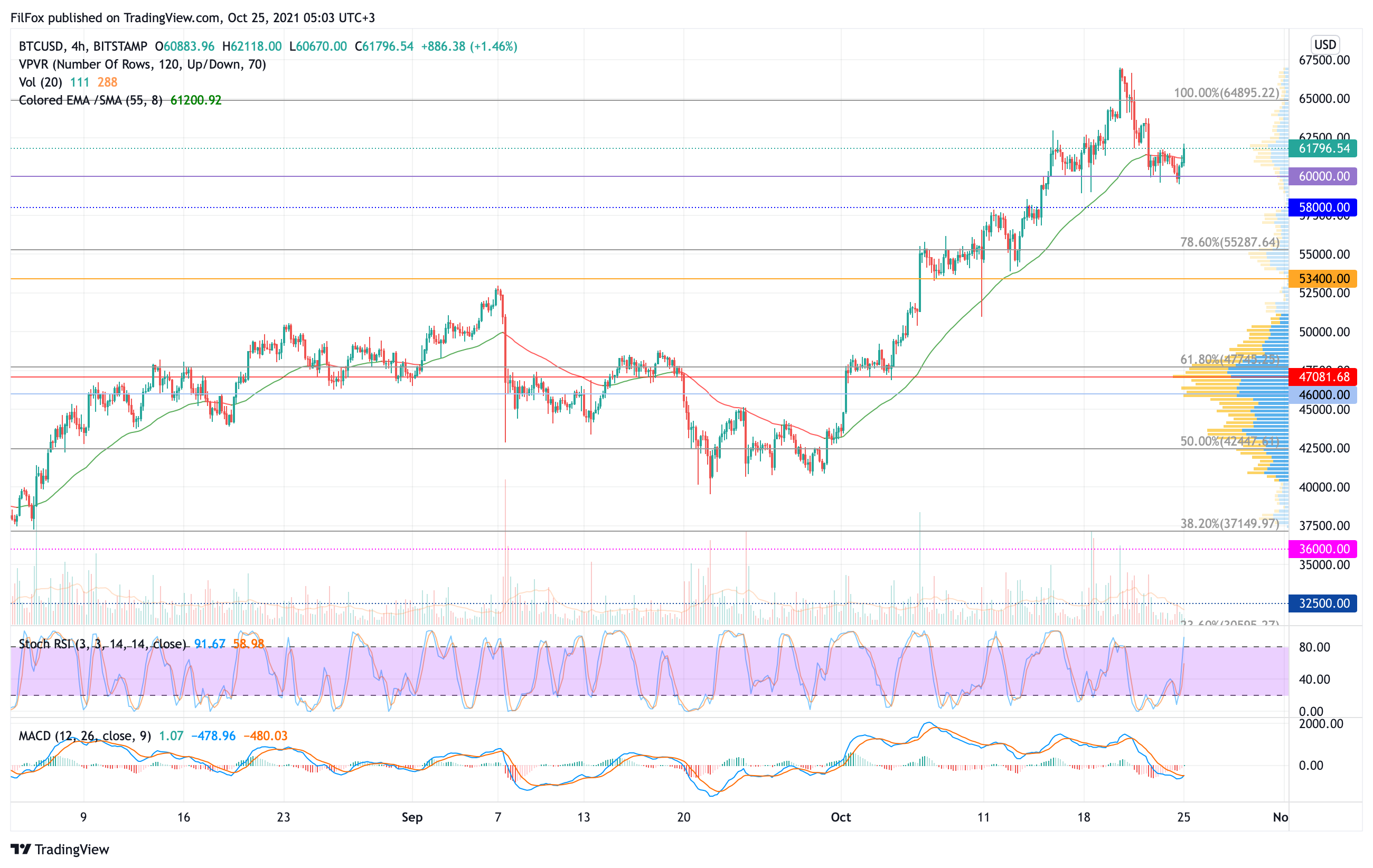 На прошедших выходных объёмы торгов были ниже среднего уровня. Цена биткоина несколько раз смогла проколоть психологический уровень 60000.00 USD, но медведям так и не удалось сформировать мощный импульс, который бы прорвал эту сильную поддержку.