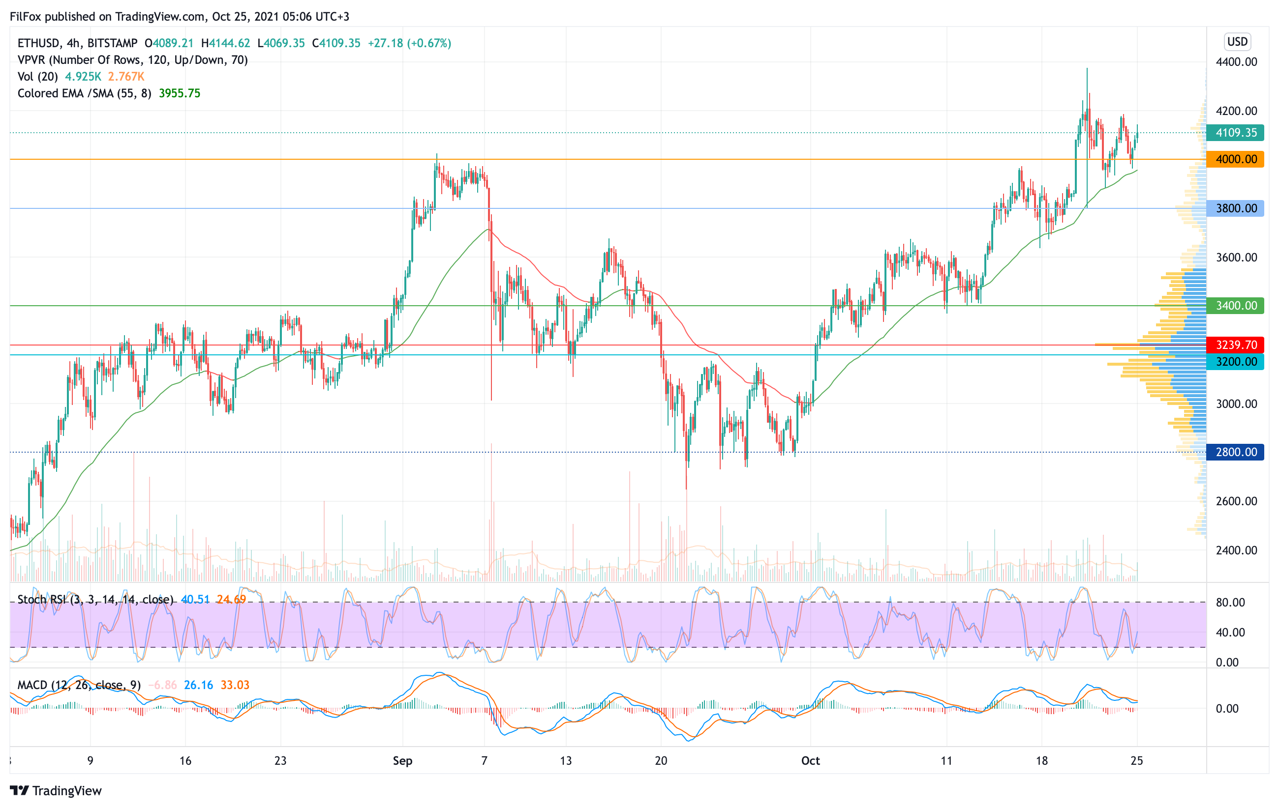 На минувших выходных цена Ethereum прочно закрепилась над психологической отметкой 4000.00 USD, но пробиться выше сопротивления 4200.00 USD пока не удаётся.