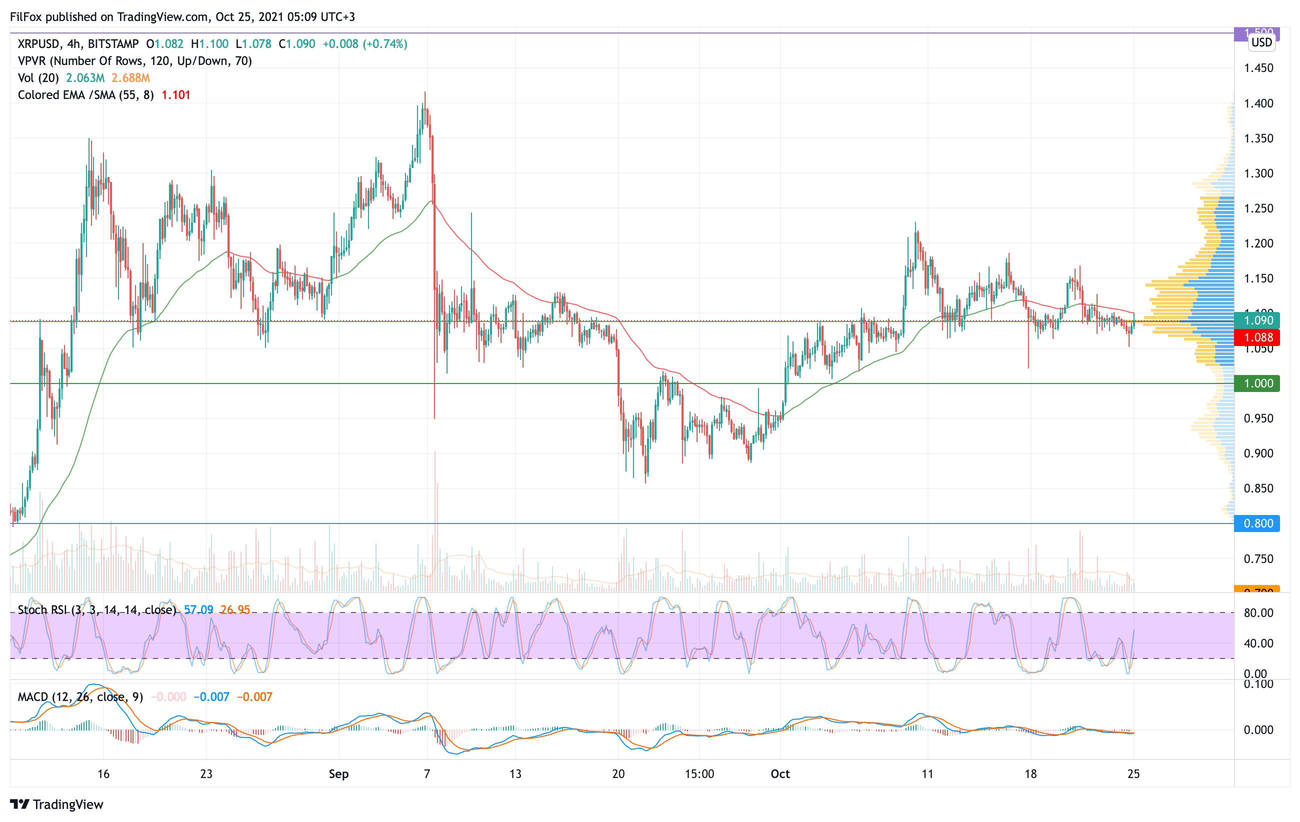 В конце прошлой недели цена XRP консолидировалась на линии POC в боковом диапазоне, верхней границей которого выступала четырёхчасовая EMA55.