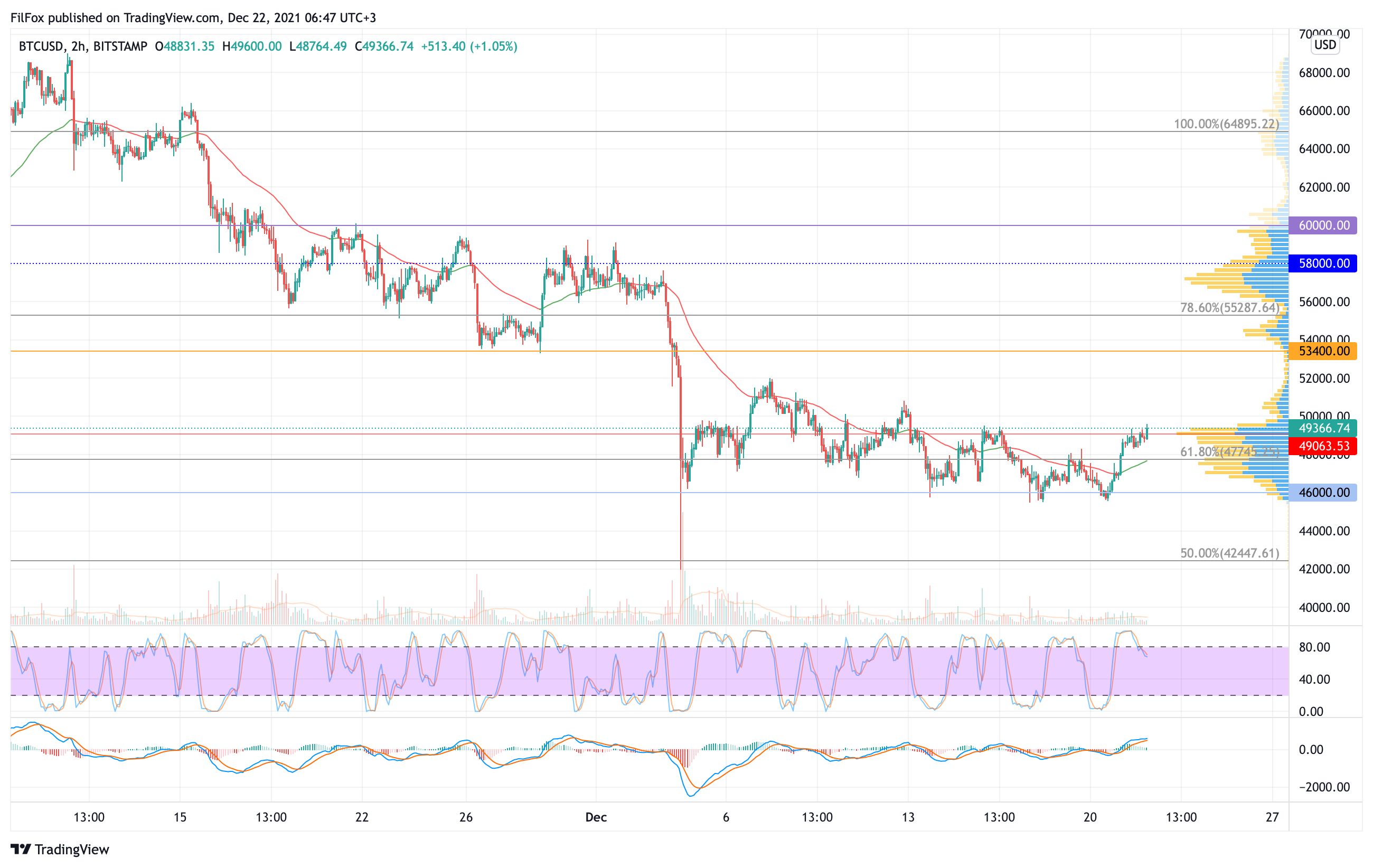 Суточный максимум обозначен в точке 49600.00 USD. В настоящее время восстановление существенно замедлилось, и быкам довольно трудно пробиться в зону пятидесяти тысяч долларов.