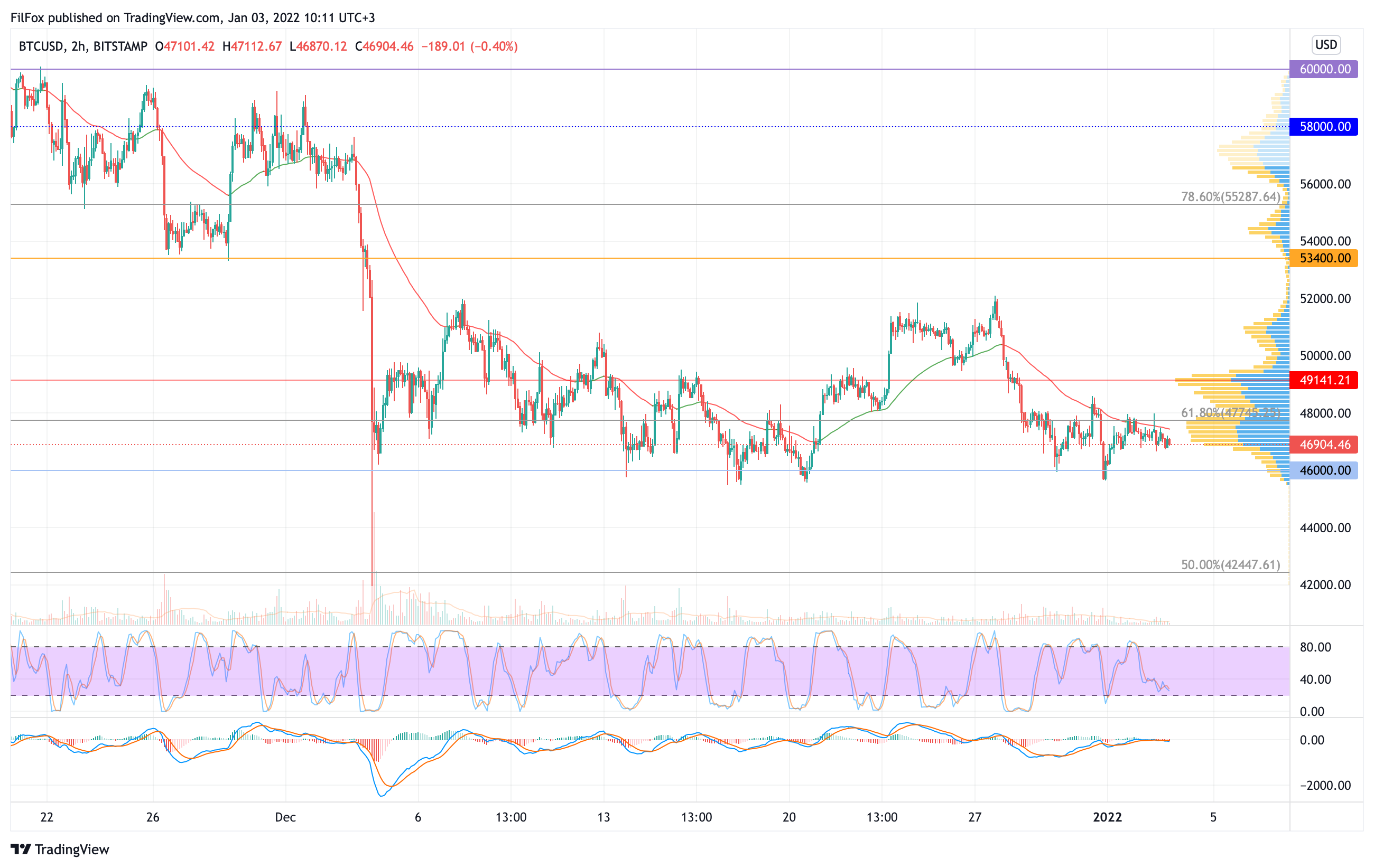 В последний день уходящего года медвежий натиск был настолько сильным, что смог оттеснить цену биткоина из области средних цен к поддержке 46000.00 USD. Цена проколола поддержку и установила локальный минимум в районе отметки 45655.00 USD.