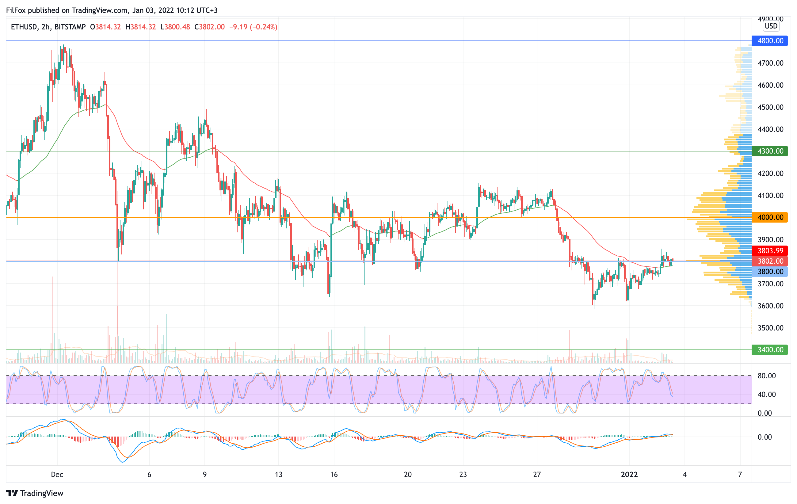 В воскресенье, второго января, цена эфира смогла пробить скользящую среднюю и закрепиться в узкой консолидации в районе поддержки 3800.00 USD. Если сегодня покупатели смогут воспользоваться поддержкой уровня средних цен, то они попытаются вернуть пару к психологической отметке 4000.00 USD.