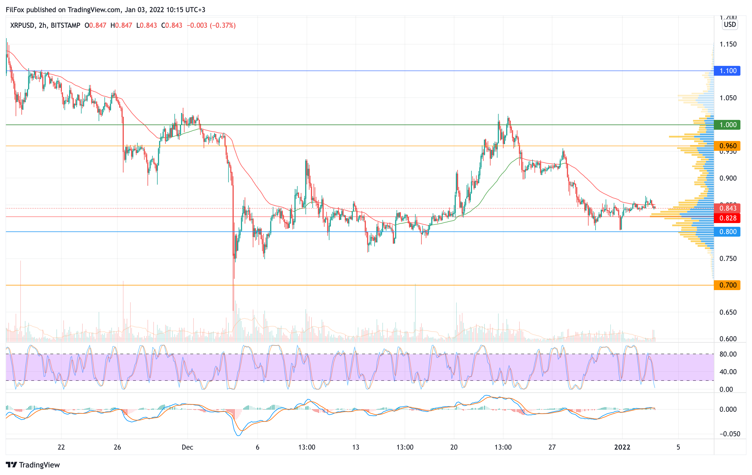 В конце декабря продавцы оттеснили цену XRP к поддержке 0.800 USD, но в новом году покупатели смогли вернуть пару выше двухчасовой EMA55. Однако, пара не смогла закрепиться над скользящей средней и просела в район отметки 0.840 USD.