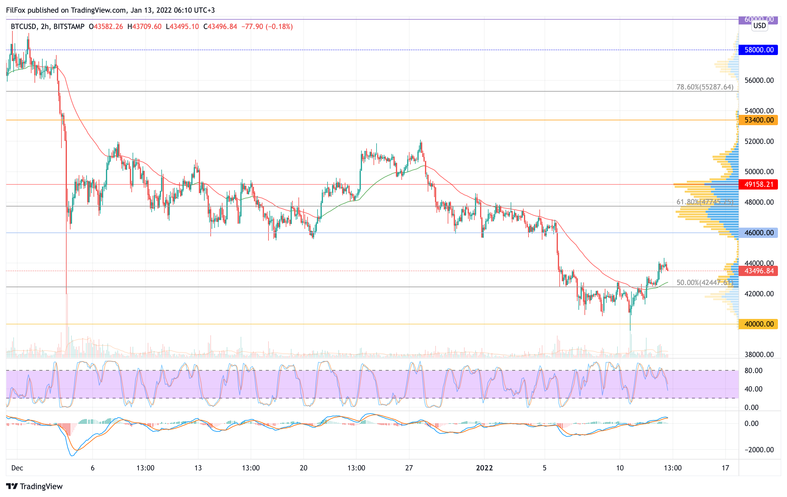 Вчера в первой половине дня цена биткоина закрепилась выше 50% фибо (42447.61 USD), и до конца дня смогла протестировать уровень 44000.00 USD. Дневной максимум зафиксирован в районе отметки 44 337.00 USD.