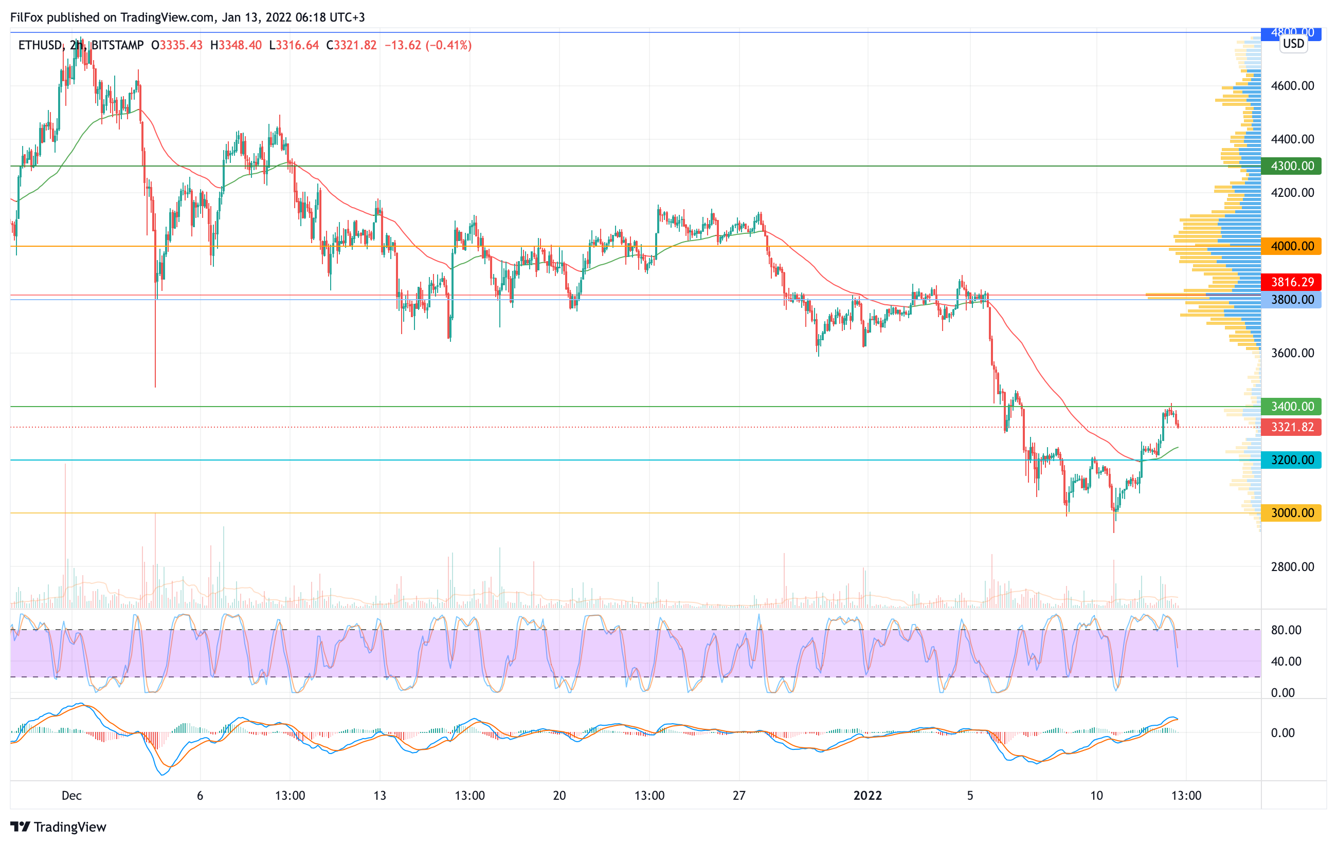 Цена Ethereum закрепилась вчера выше уровня 3200.00 USD. В завершении дня пара протестировала зелёное сопротивление 3400.00 USD.