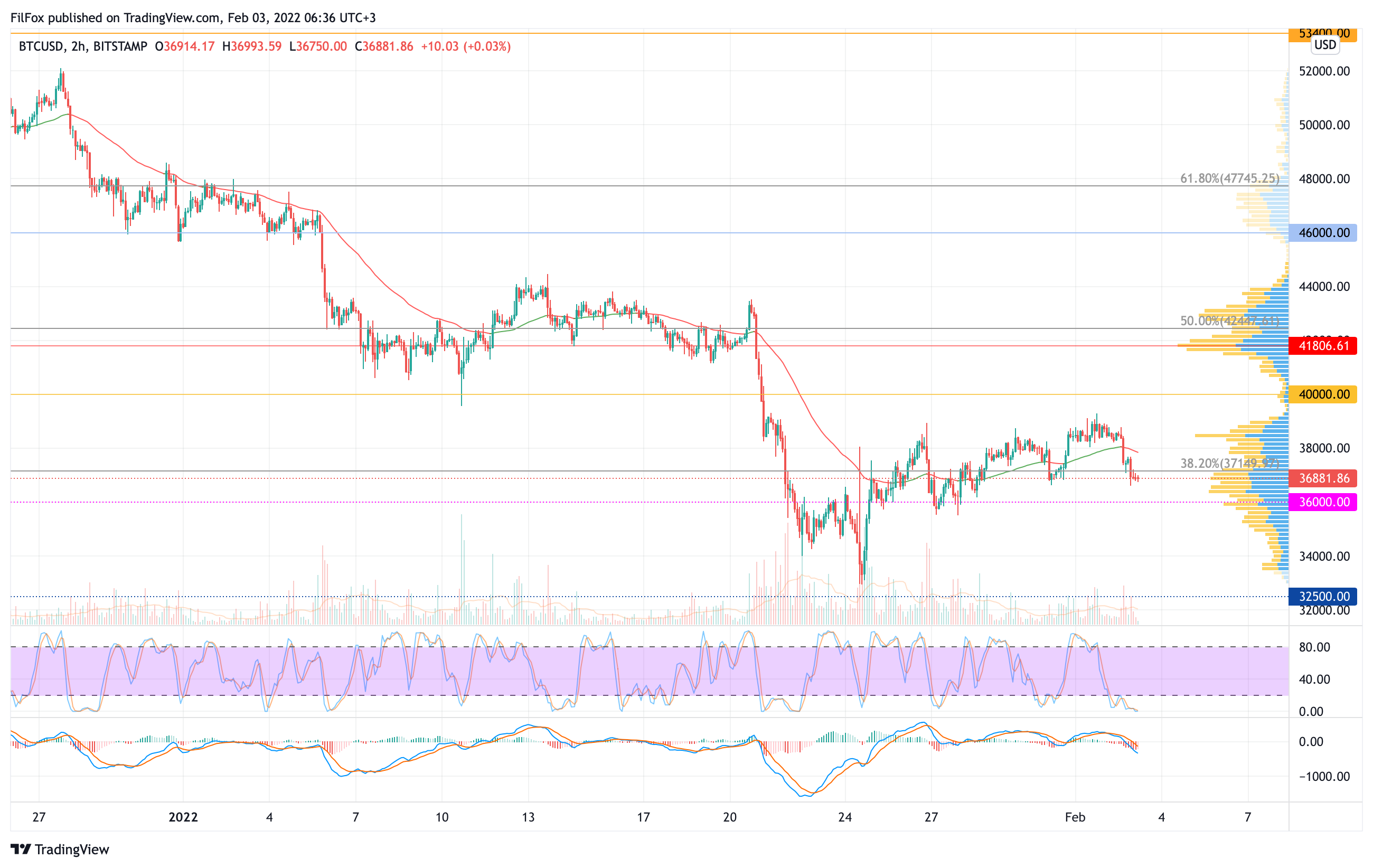 Вчера с самого утра продавцы доминировали на рынке и быки не смогли возобновить штурм сопротивления 38900.00 USD. Во второй половине дня медвежий импульс отбросил пару ниже двухчасовой EMA55, а к концу дня цена биткоина пробила поддержку уровня 38.2% фибо (37149.97 USD).
