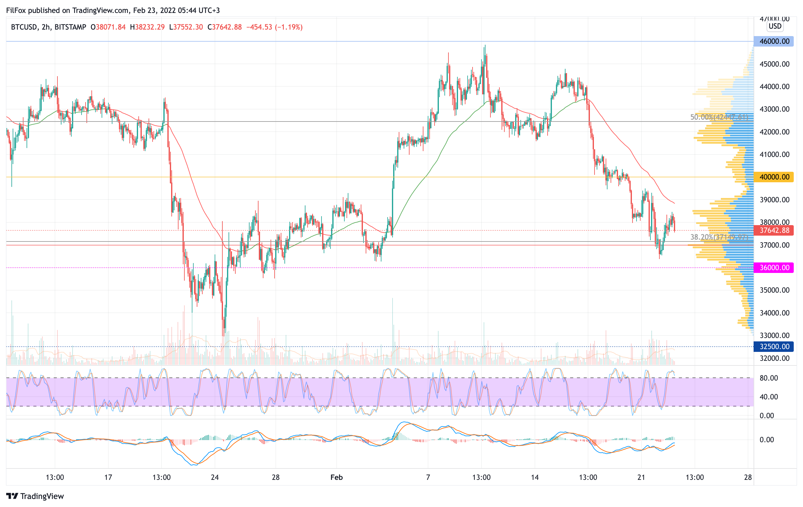 Вчера утром продавцы не успели протестировать поддержку 36000.00 USD. В течение дня покупатели восстановили цену биткоина выше уровня 38.2% фибо (37149.97 USD), но сегодня пара не сможет закрепиться над ним.