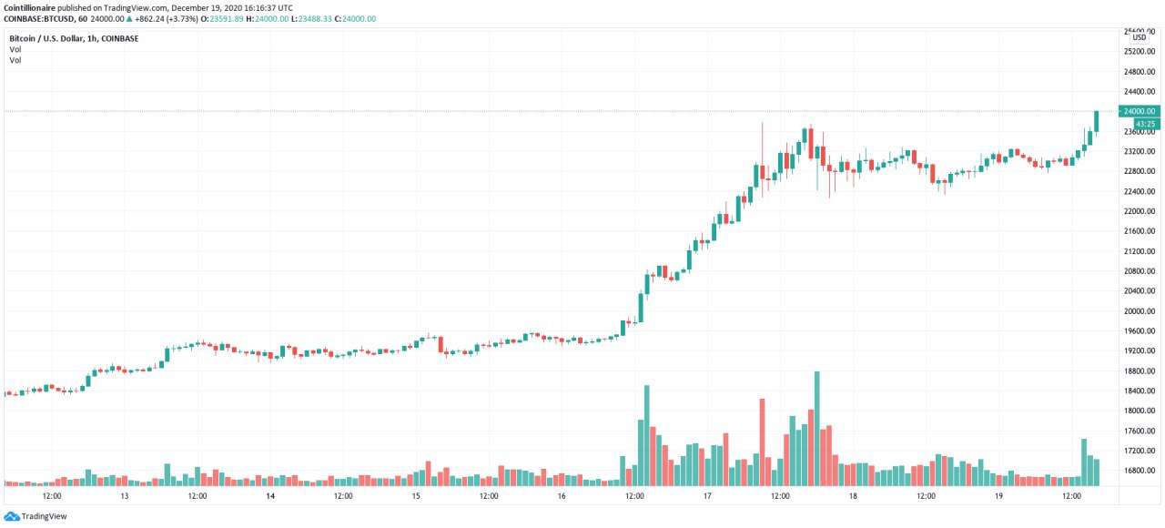 На момент публикации максимум был установлен на отметке $24210 на бирже Coinbase.