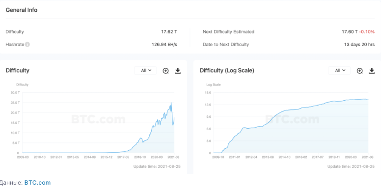 Сложность добычи биткоина зафиксировал самое большое падение в истории 3 июля, на фоне рекордного снижения хешрейта. Только в конце месяца показатель начал восстанавливаться, и в середине августа увеличился на 7,31%, впервые с высоких майских показателей.