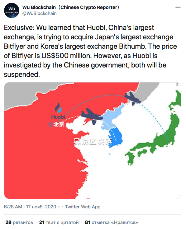 Кроме того, Huobi так же рассматривает возможность приобретения Bitflyer, крупнейшей криптобиржи Японии с 2,5 миллионами пользователей за аналогичную сумму.