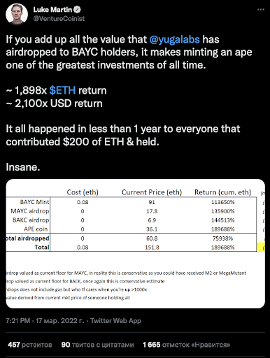 Bored Apes - первая NFT-коллекция - была запущена весной 2021 года, и с тех пор общий объем продаж токенов подскочил до 1,4 млрд долларов. В марте команда проекта представила свою криптовалюту ApeCoin и провела Airdrop.