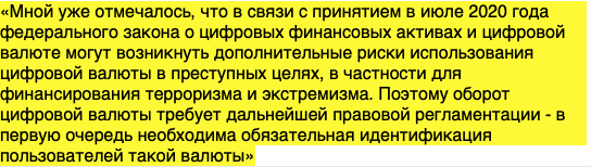 В своем интервью глава ведомства резко высказался в адрес анонимности держателей криптовалют. По его мнению, цифровые валюты нуждаются в строгом регулирование, потому что все чаще используются для незаконной деятельности. Глава СК считает, что принятый закон о цифровых финансовых активах не обеспечивает от риска использования криптоактивов для финансирования терроризма и требует правовой доработки.