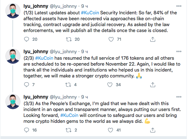 Биржа KuCoin восстановила 84% украденых активов и возобновила полное обслуживание 176 из 230 торгуемых монет.
